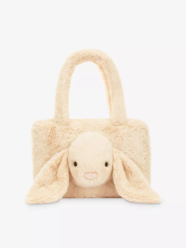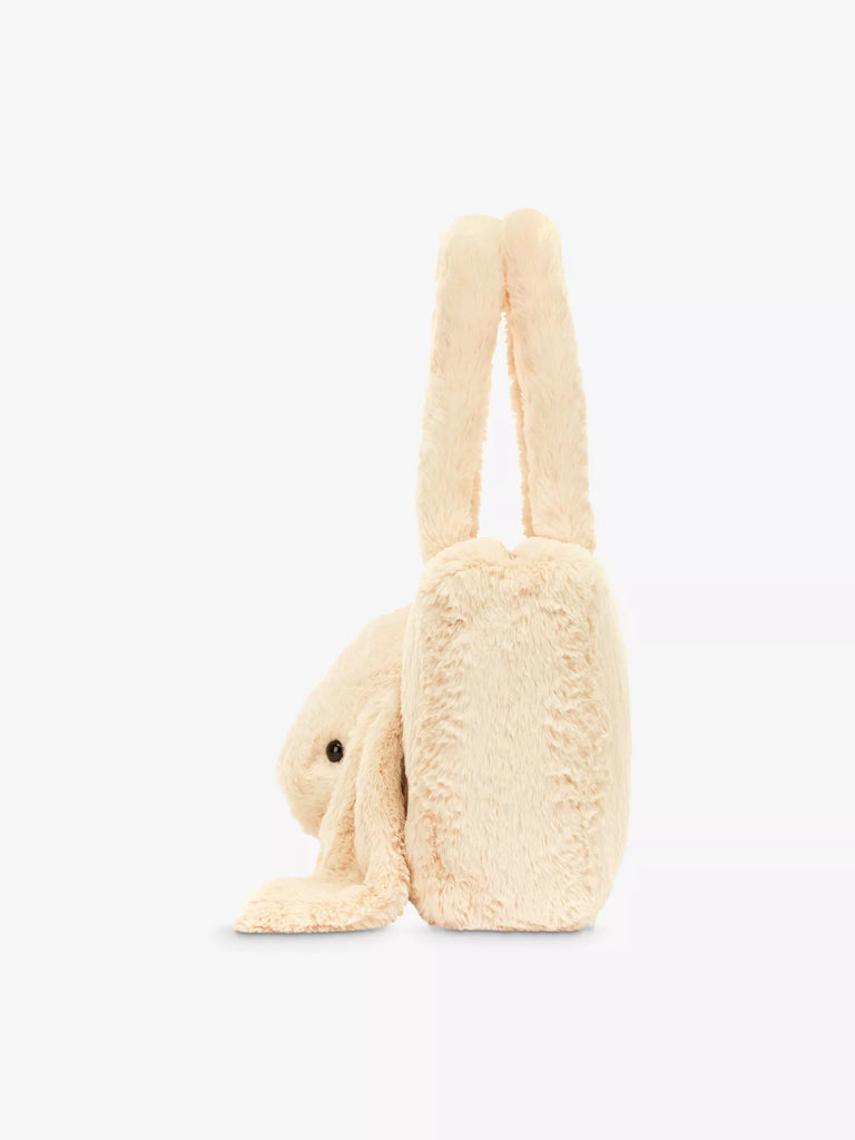 Turn heads with the Smudge Rabbit Tote Bag. This rich oatmeal bag has comfy fuzzy handles and a stunning lop-eared bunny head. Soft but sturdy, with a cotton lining and silver zipper with jellycat tag, it’s the kookiest way to carry your things.