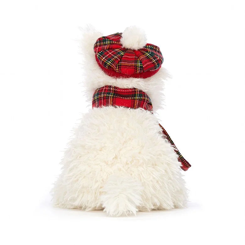 Winter Warmer Munro Scottie Dog is snuggled up in a red tartan tam o’ shatter and matching crossover scarf. With gorgeous shaggy fur, a black nose and pink inner ear, Munro is the pup for toasty cuddles.